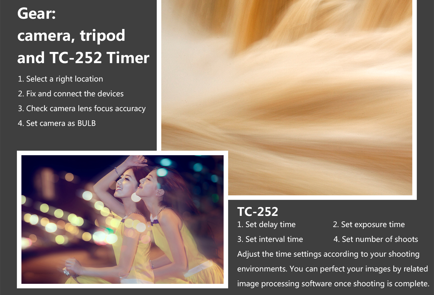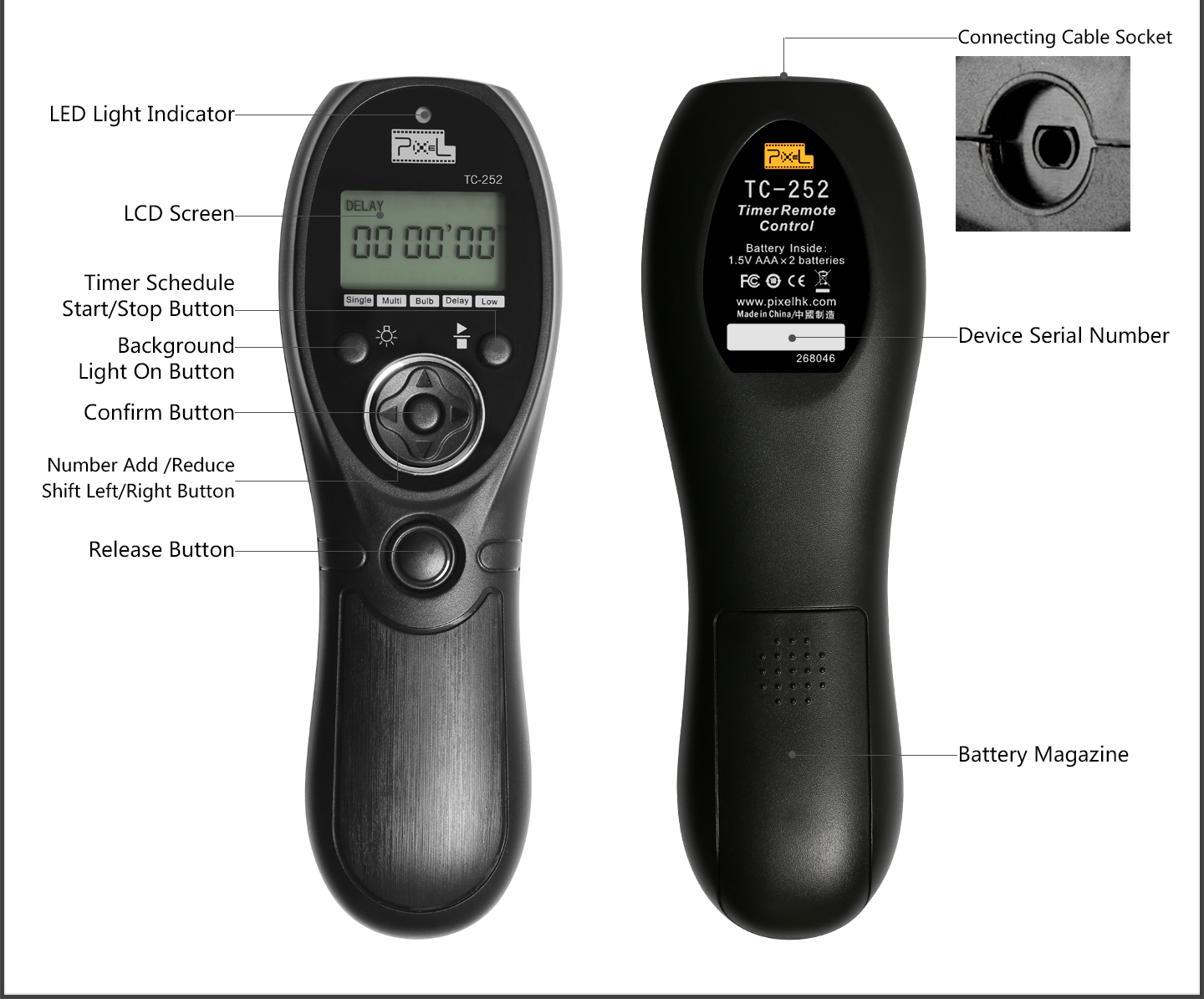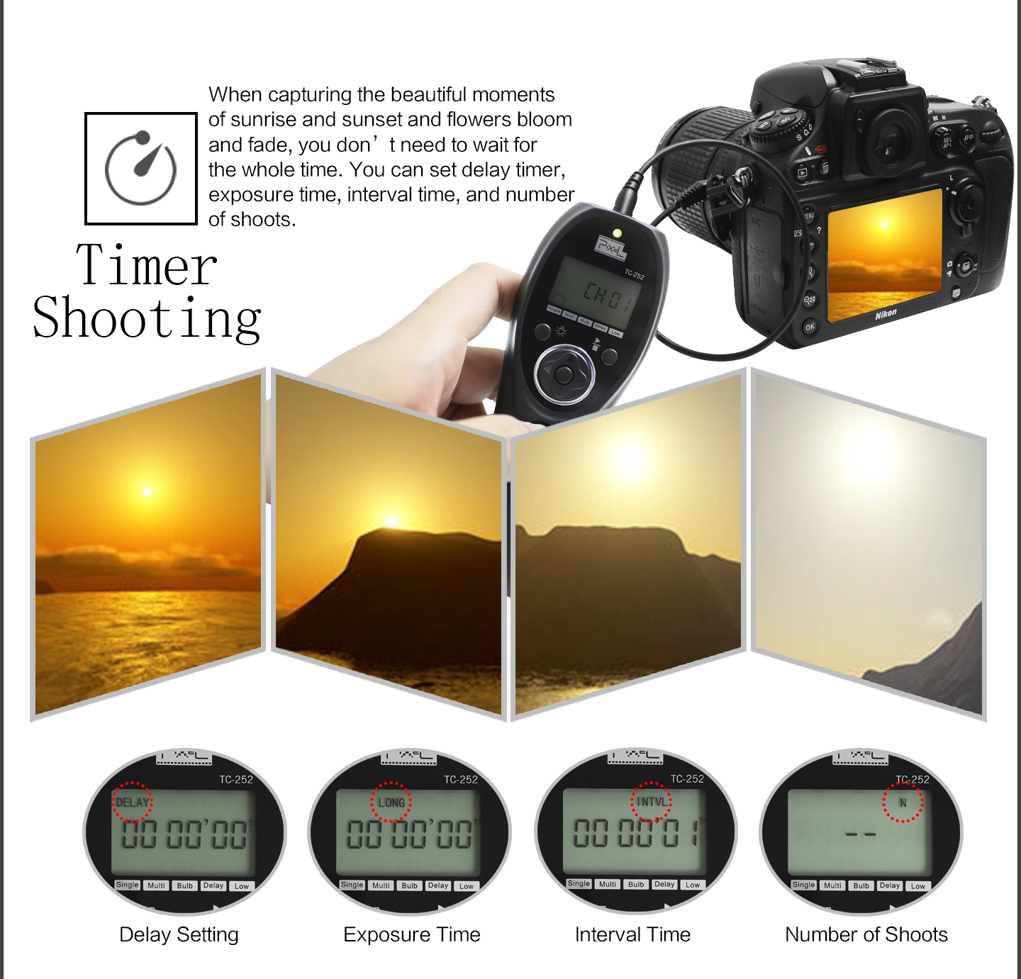 1. TC-252 function is single, continuous, bulb, delay shooting modes; and also timer planning shooting mode.