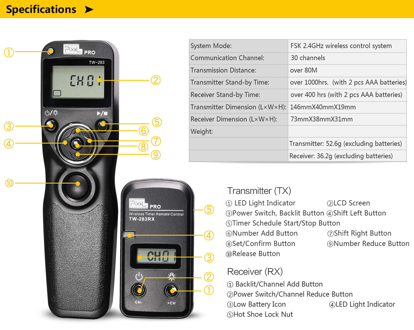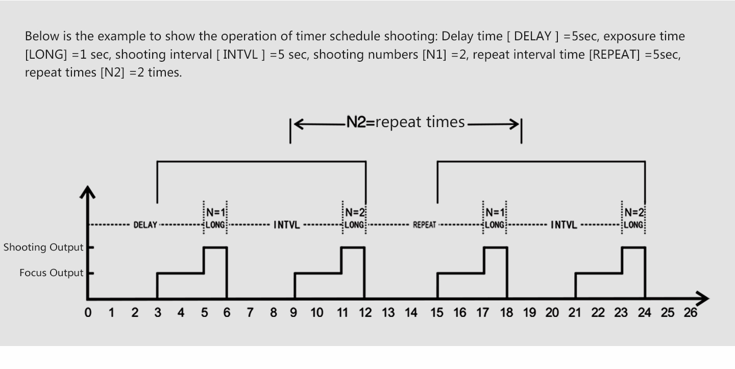 3. Timer Schedule shooting time can be set from 0 sec to 99hrs59mins59sec. Shooting number can be set from 1 to 99.
