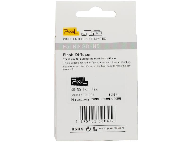 SB-N5 is a Flash Diffuser for Nikon. Product description: the material is soft and flexible which can match well with flash. It has an accurate color temperature. When it is thin, it looks transparent; thick, the molecule is lattice which makes the flash light scattering and looks translucent. Its temperature resistance is up to 130 degree. With good flexibility and cracking resistance, it has a stable chemical property. The material: polyethylene. It is used in plastic wrap and some other non-toxic food package.