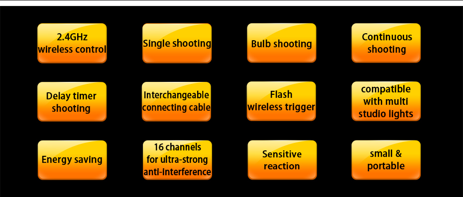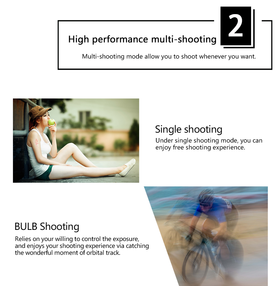 4. Available to shoot with single, Bulb, continuous, delay mode.