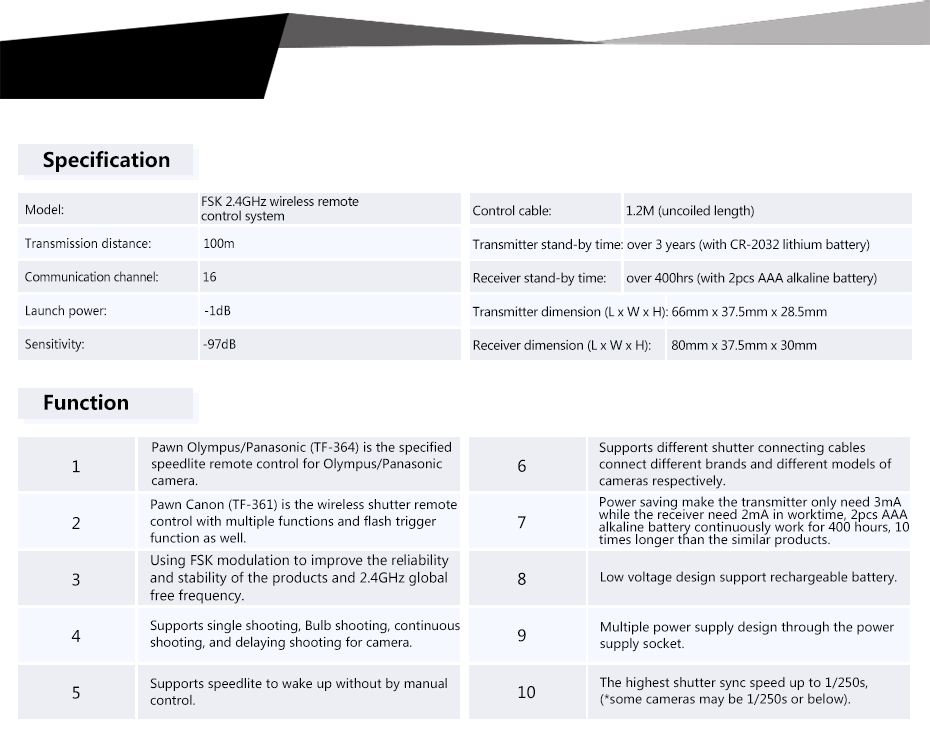 2. Pawn For Olympus And Panasonic is multi-function wireless shutter remote control, and flash trigger function.