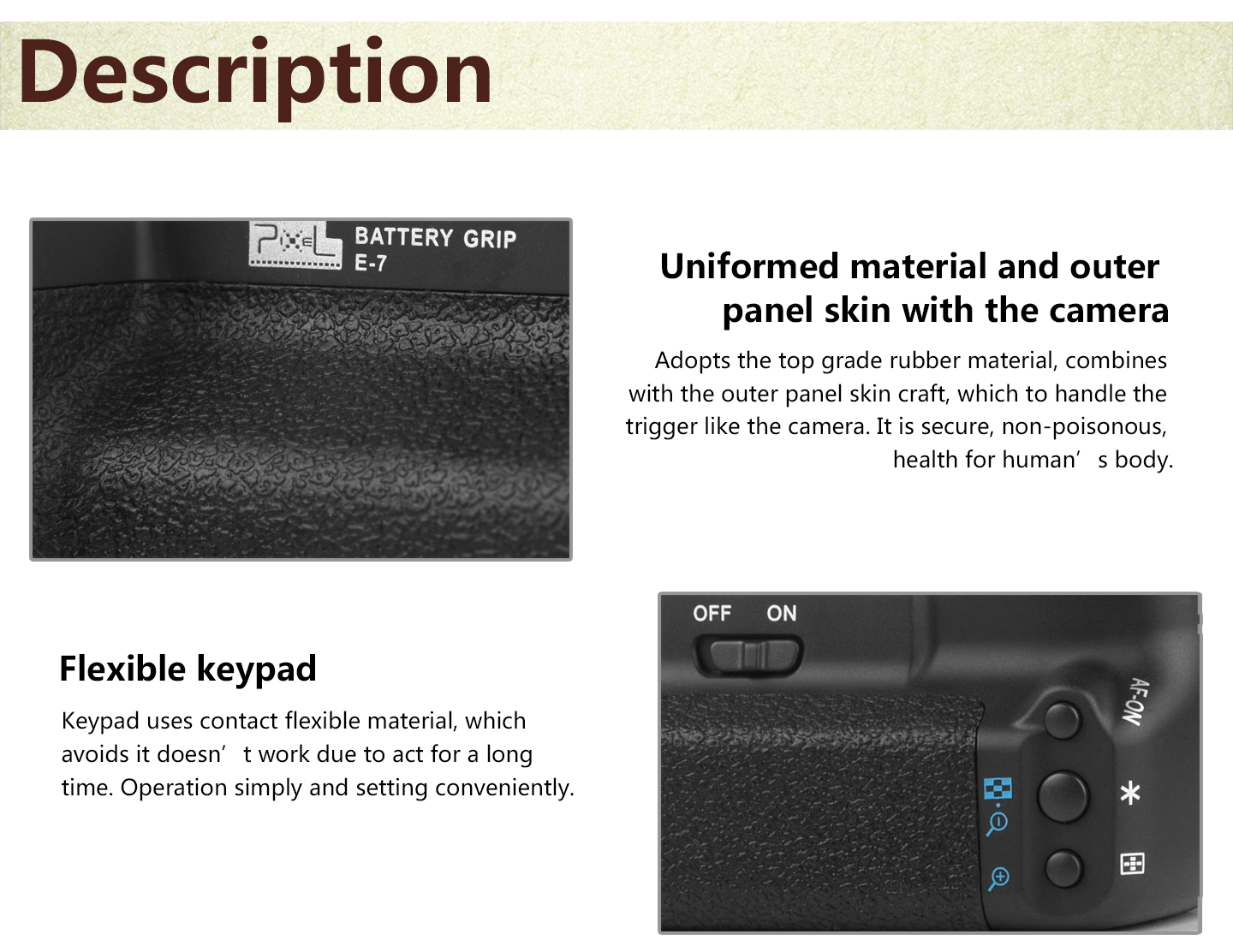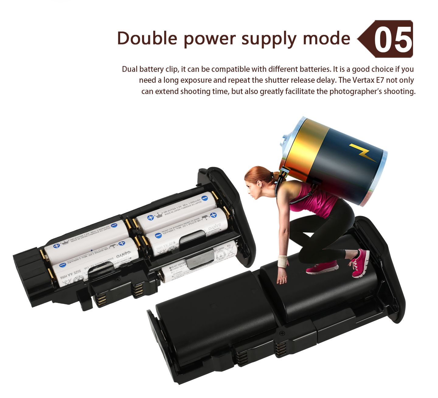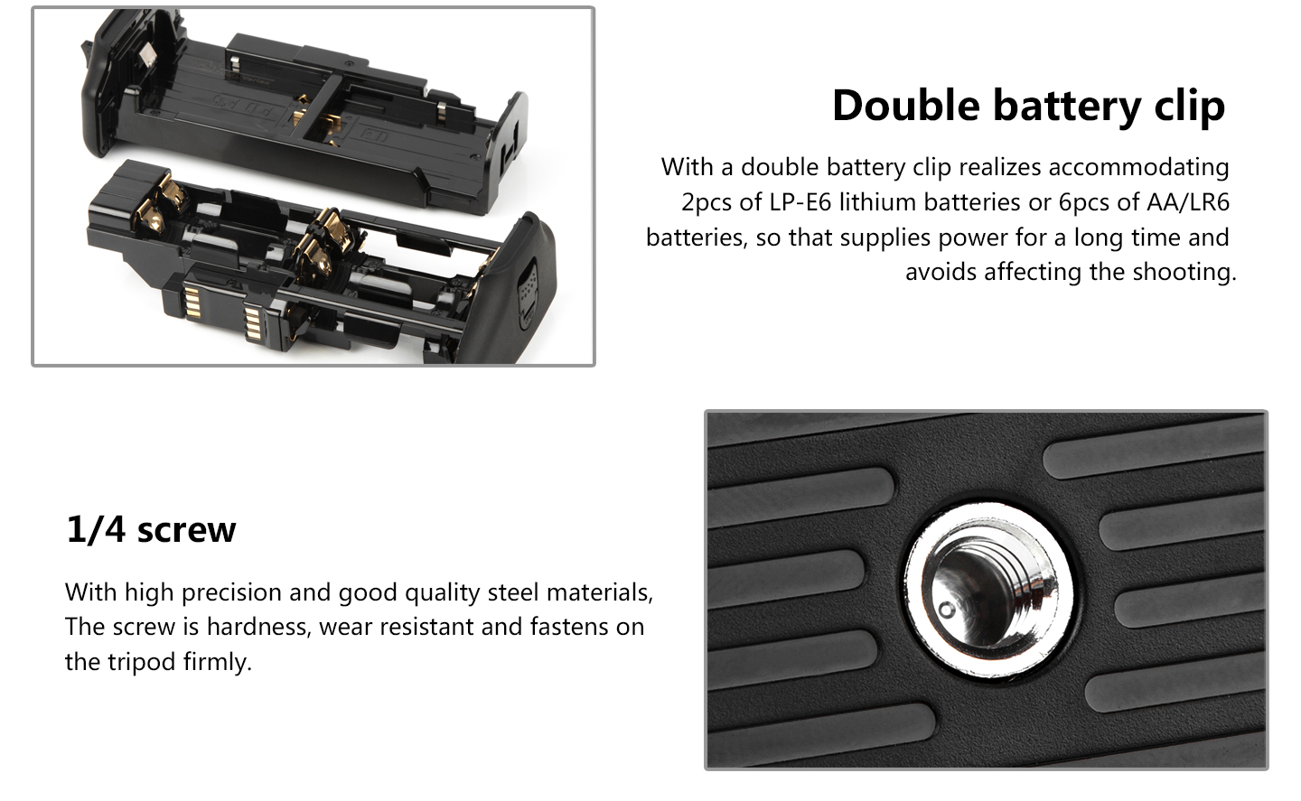 Power Source: (1) one or two LP-E6 battery (2) six AA/LR6 alkaline batteries