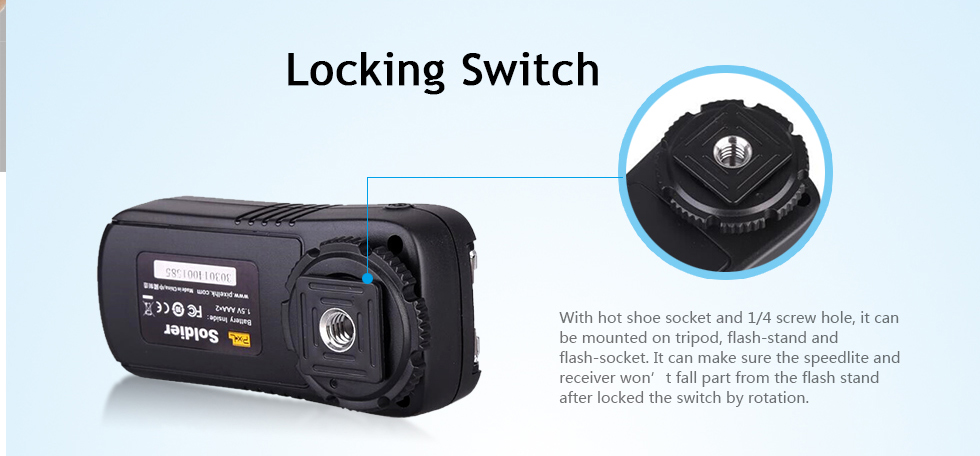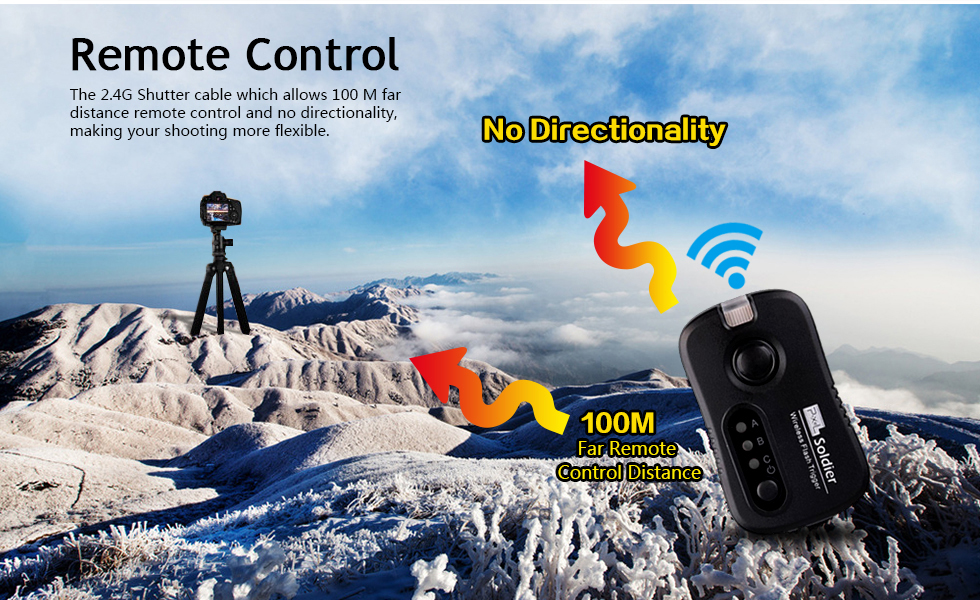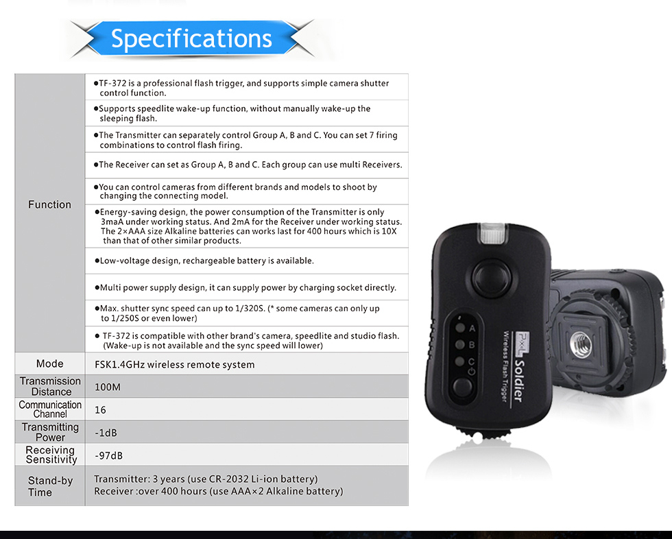 Soldier Nikon (TF-372) wireless flash group/shutter remote control is a professional flash trigger. It has simple function the shutter control. It also has the function of wake-up. There is no need to wake up the flash manually. TF-372 is compatible with cameras, flashes and studios of other brand.