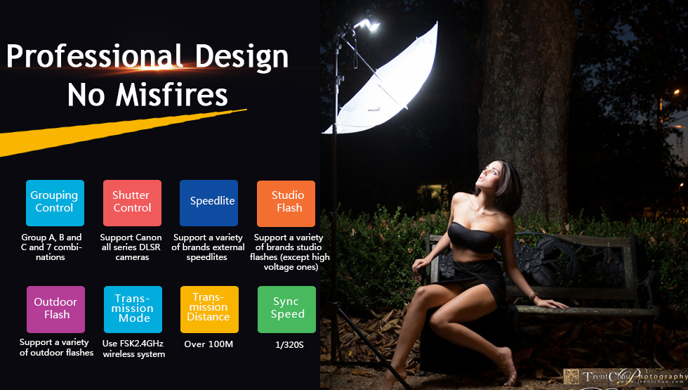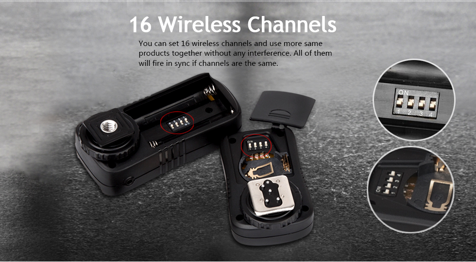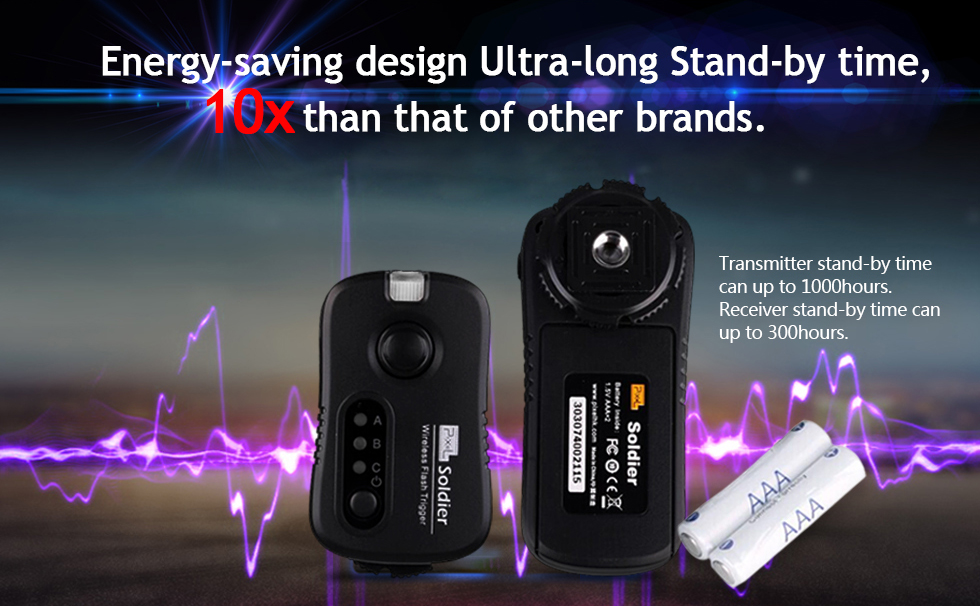 Product Specification Applicable To: Nikon Type: FSK 2.4GHz Wireless System Operation Range: 100M Channel:16 Transmit Power: -1dB Sensitivity:-97dB Cable length:40cm Transmitter Stand-by Time:10,000 hours(CR-2 lithium-ion battery) Receiver Stand-by Time: 400 Hours (2pcs AAA alkaline battery) Transmitter Measurement (L*W*H) : 66 X 37.5 X 28.5 MM Receiver Measurement (L*W*H) : 80 X 37.5 X 30 MM