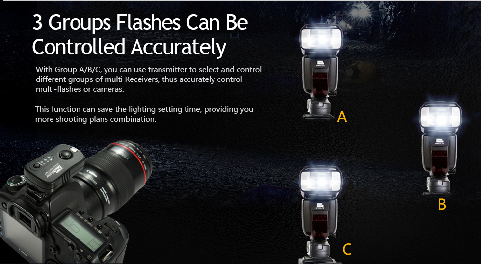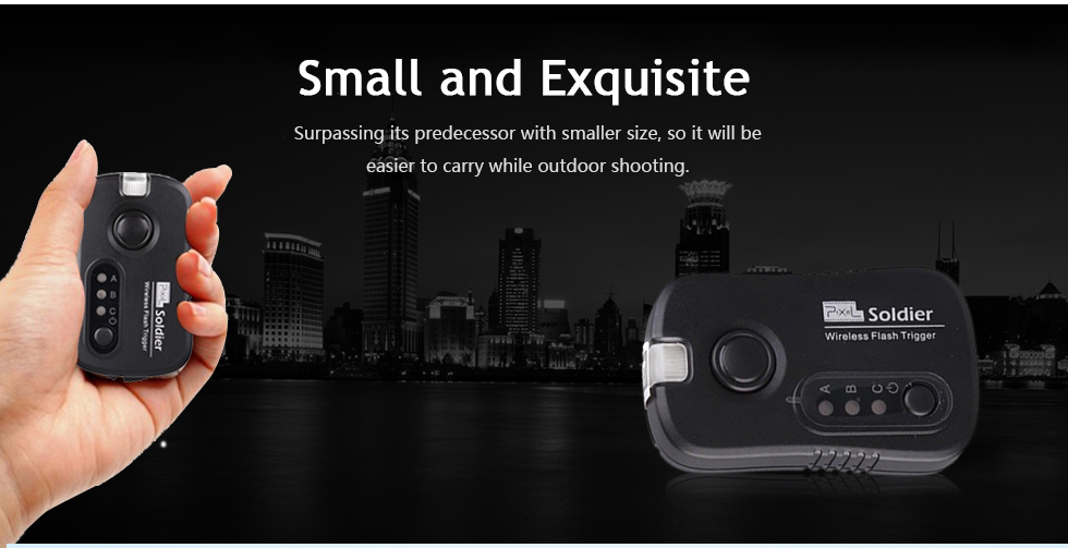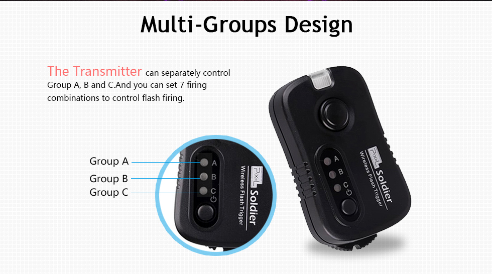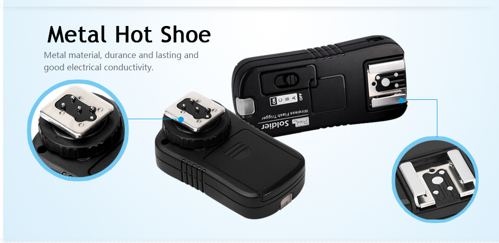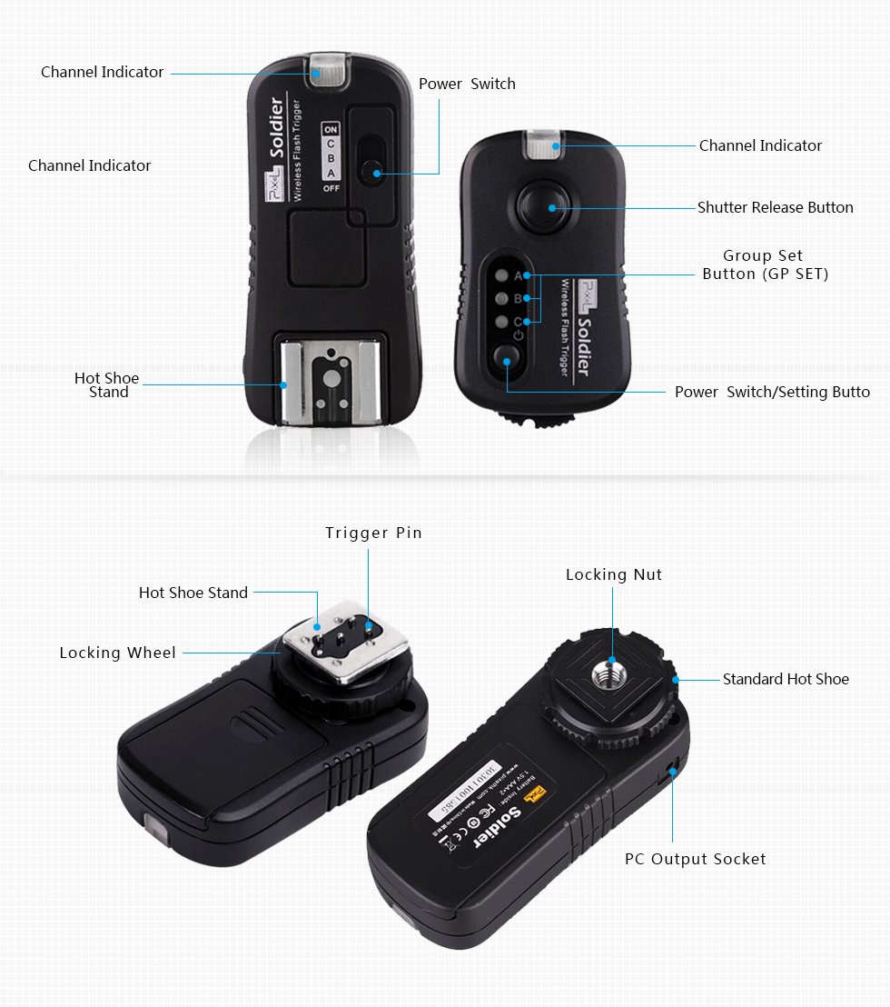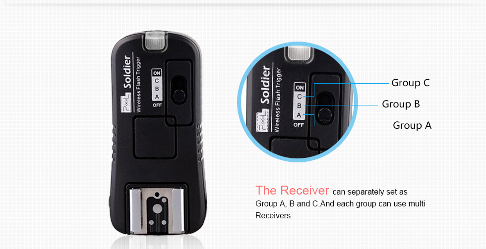 Product Function Soldier For Nikon 1. It is professional flash trigger with simple shutter remote function 2. With “wake-up” function, this can wake up the flash automatically. 3. Transmitter available to control A/B/C groups individually,and 7 differences flash combination. 4. Receiver can be set as group A, B or C; multi-receivers available for each group. 5. Changeable connecting cable for difference camera model. 6. With saving power function, the transmitter is only use 3mA under working status. Receiver is only use 2mA under working status. Battery working hour is up to 400hrs when using 2pcs of AAA alkaline battery. More than 10X compare with the similar product. 7. Low-voltage design, and available to use rechargeable battery. 8. Multi-power design, which can be use this via power socket. 9. Shutter speed up to 1/320S. (Depend the camera model, some camera are only support 1/250S or lower) 10. Above products also compatible with other brand camera, flash.and studio light (Not support "wake-up"and shutter speed will reduce)