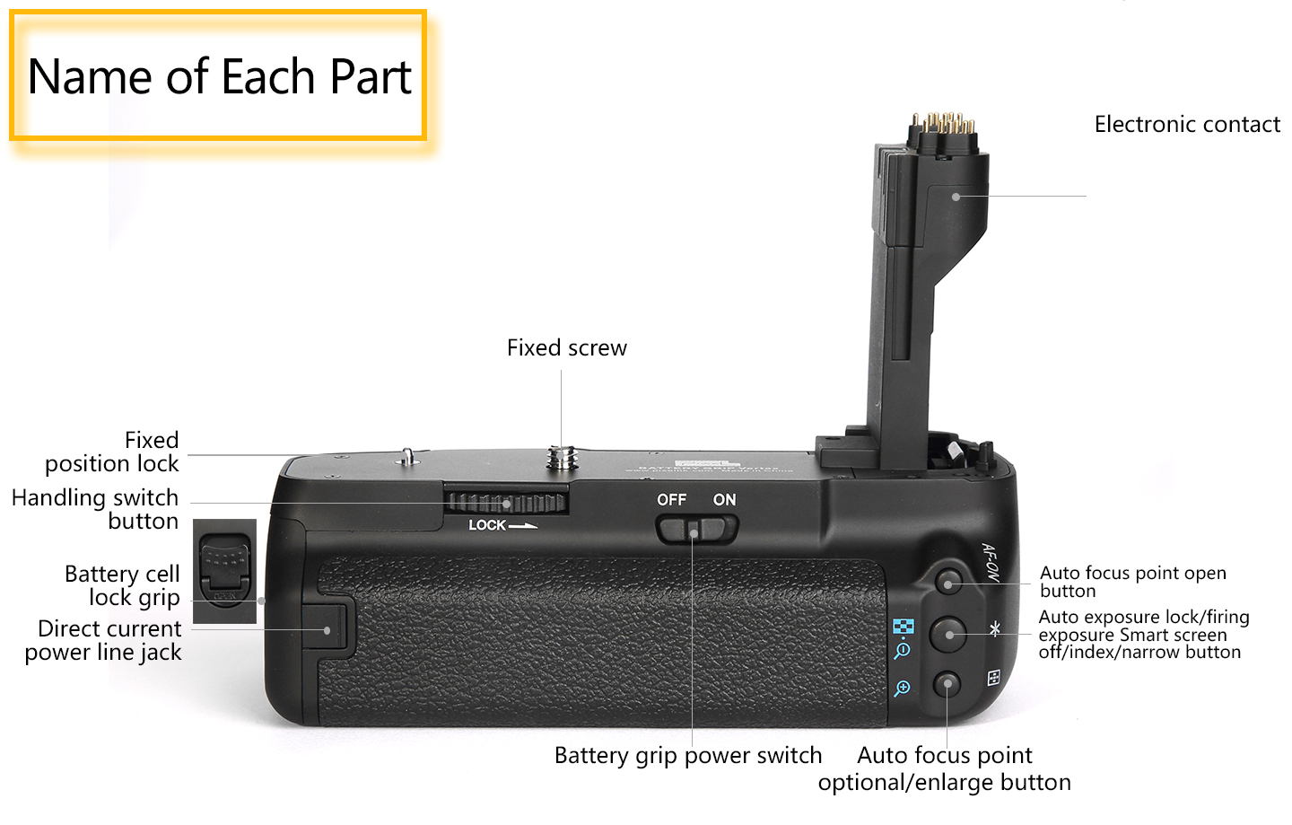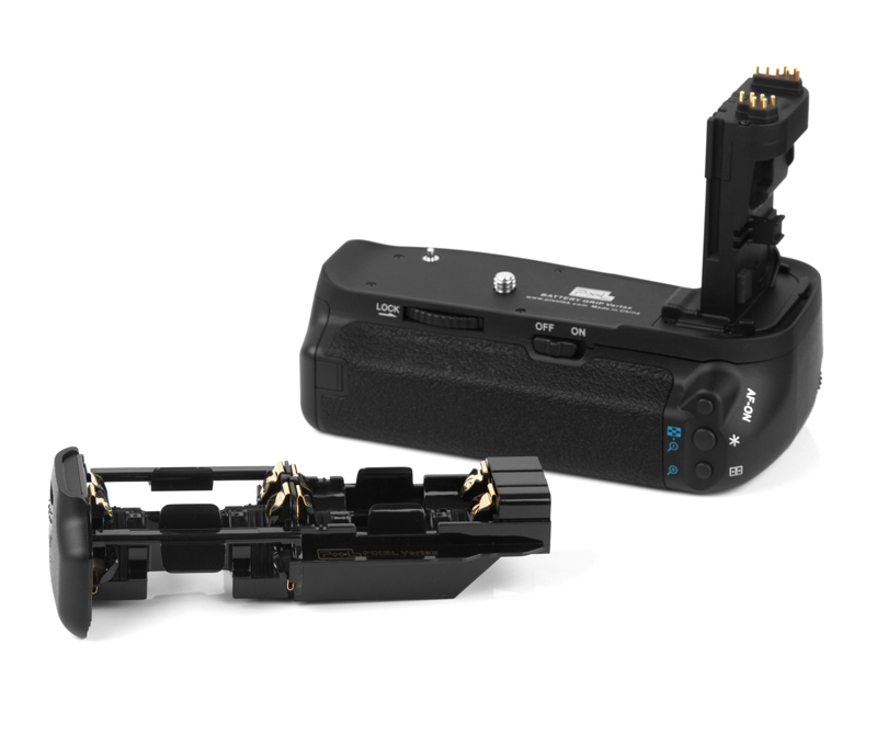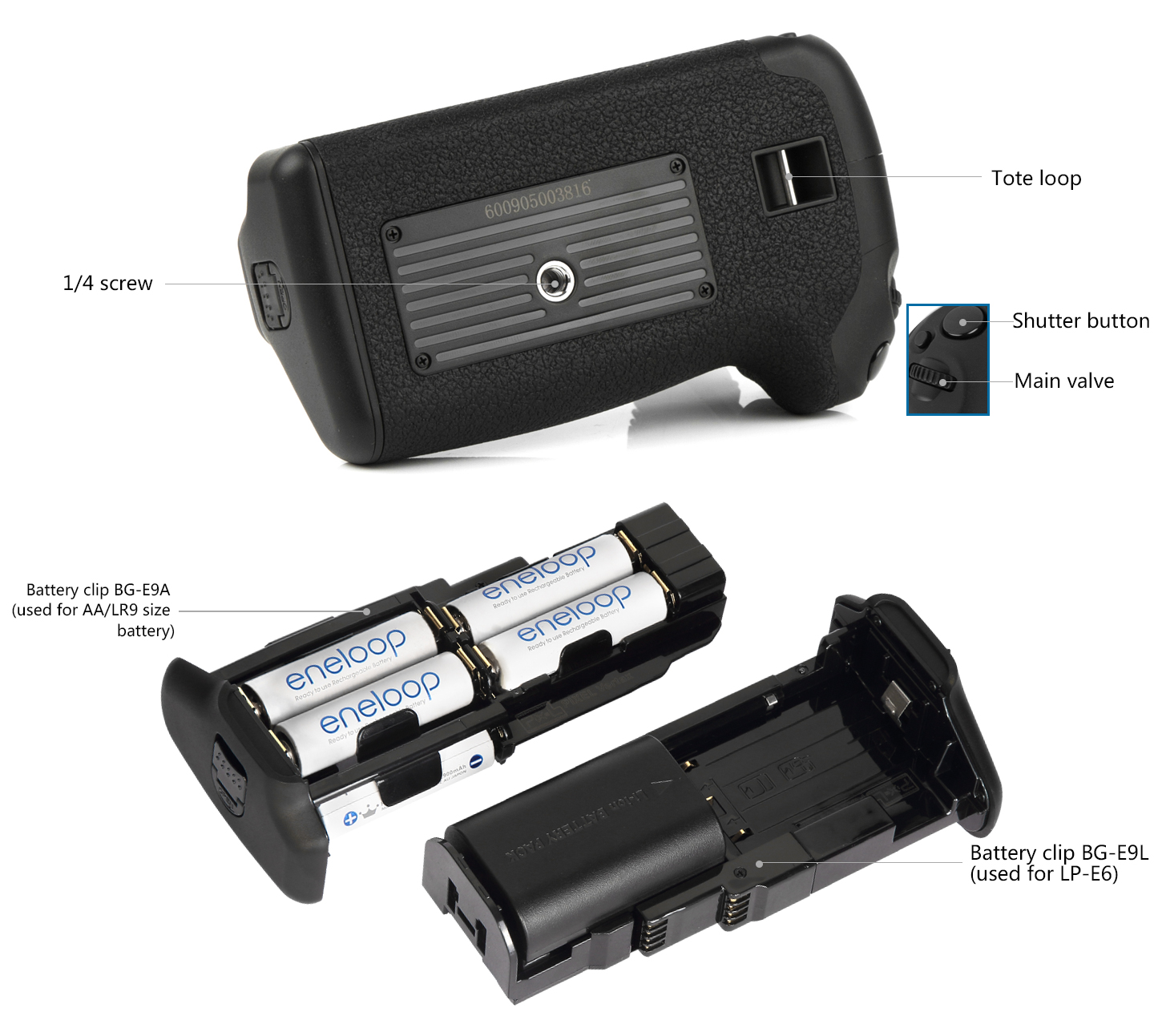 Power Source: (1) one or two LP-E6 battery (2) six AA/LR6 alkaline batteries