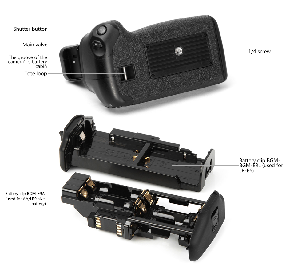 Power Source: (1) one or two LP-E6 battery (2) six AA/LR6 alkaline batteries