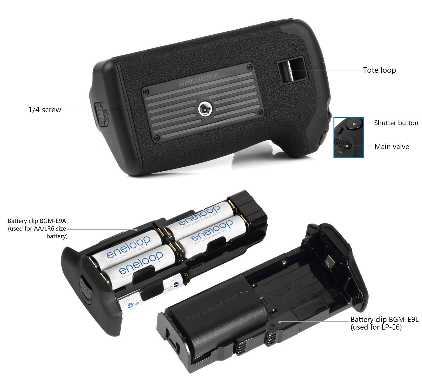 Power Source: (1) one or two LP-E6 battery (2) six AA/LR6 alkaline batteries