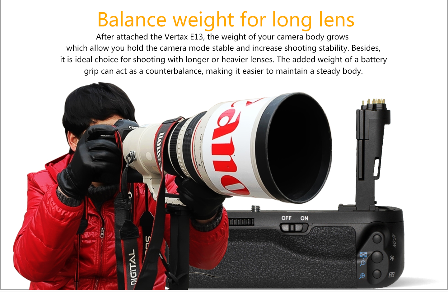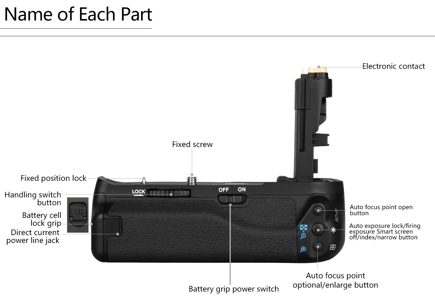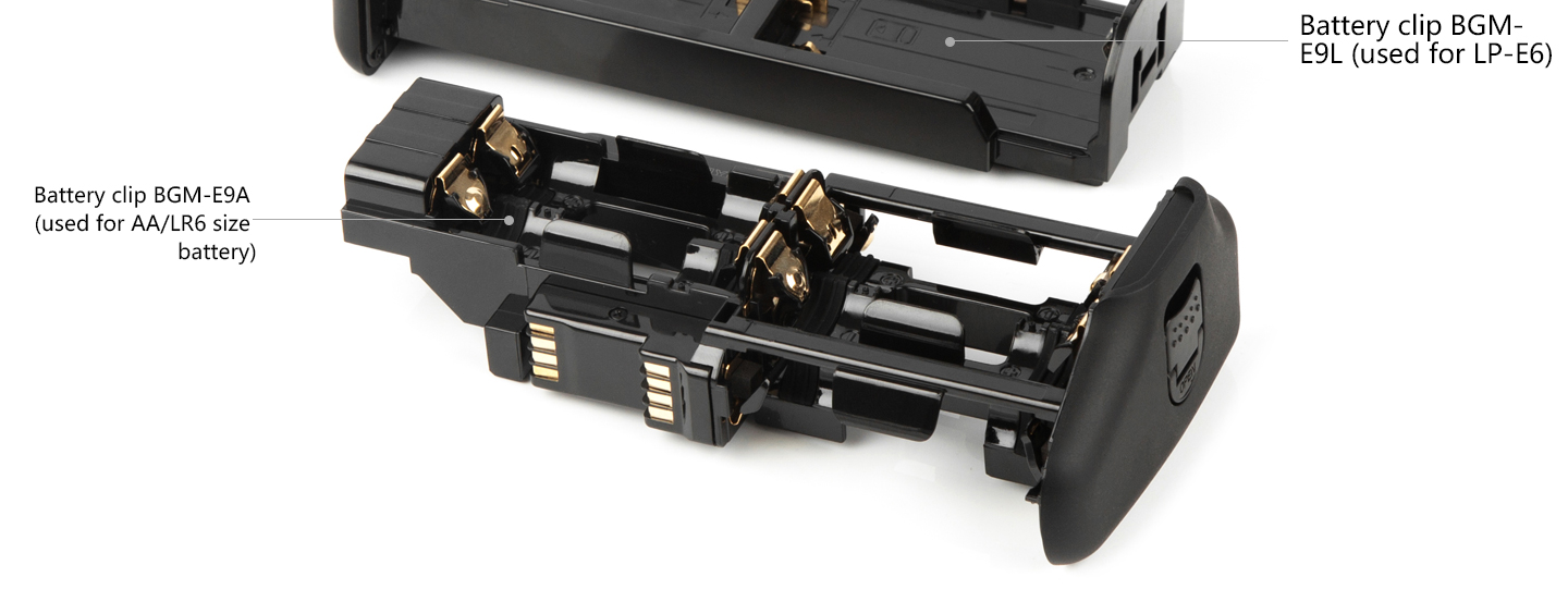 Power Source: (1) one or two LP-E6 battery (2) six AA/LR6 alkaline batteries