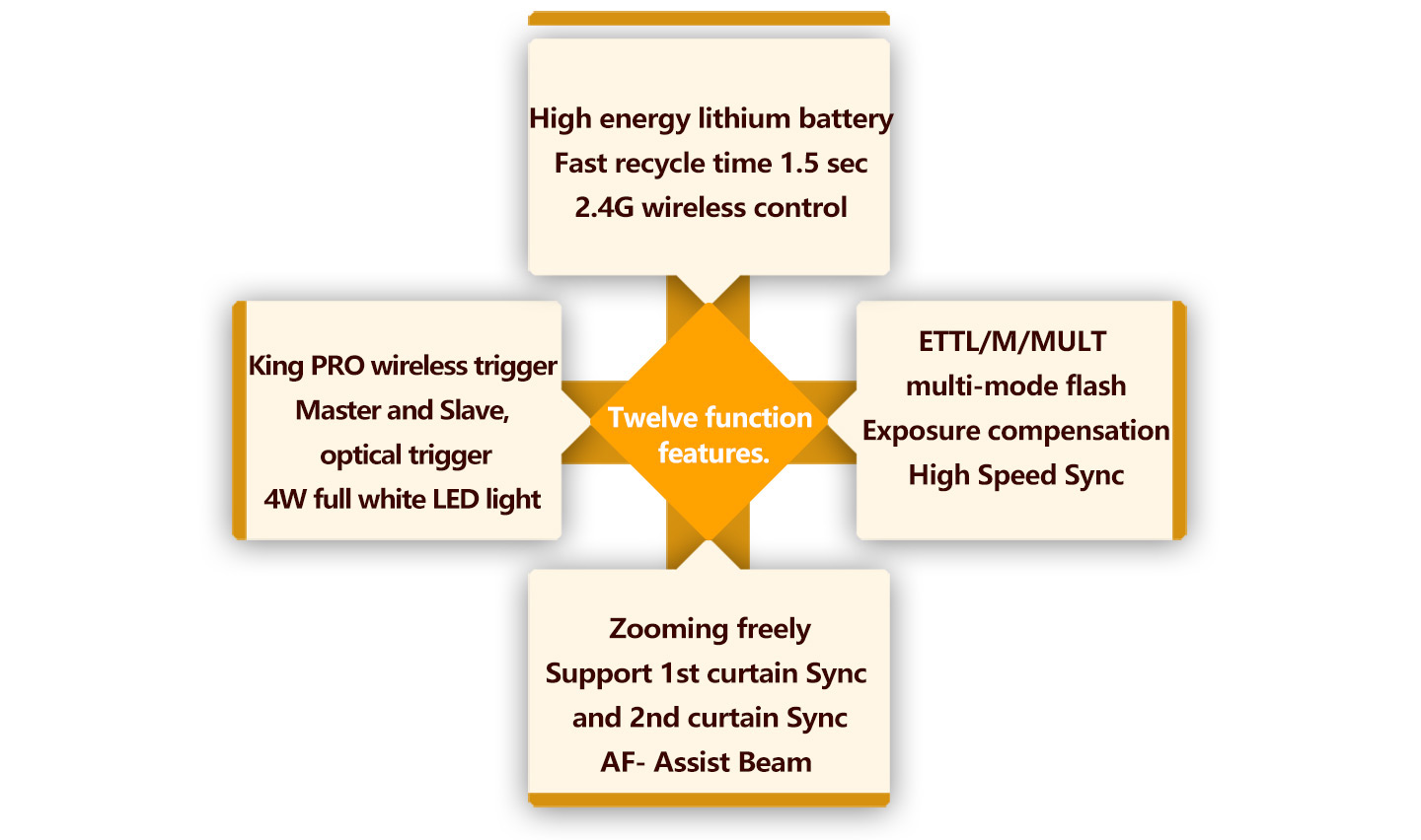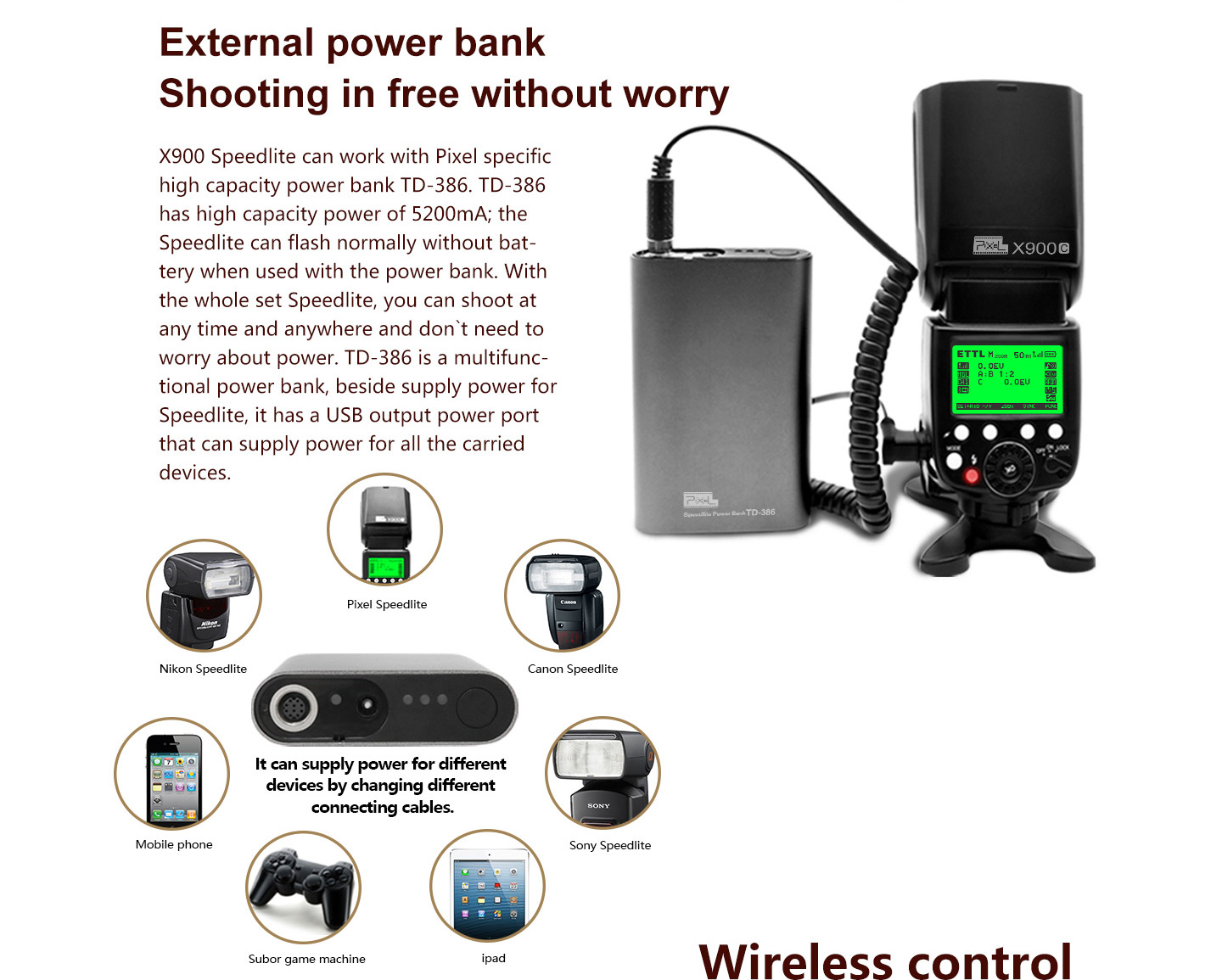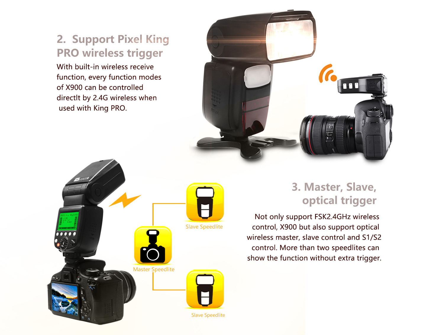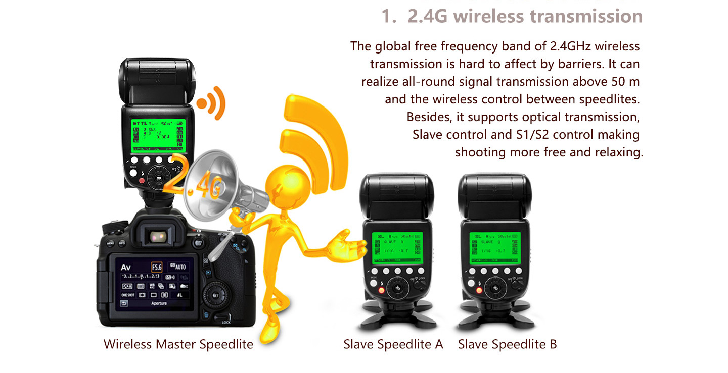 Wireless flash: 2.4G wireless control, optical transmission /support optical control/ Master/ Slave, S1/S2
