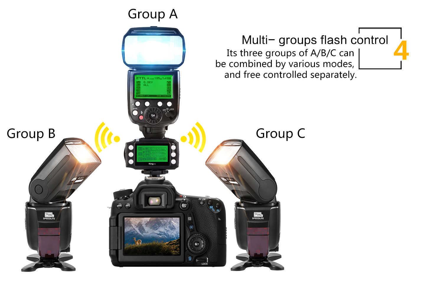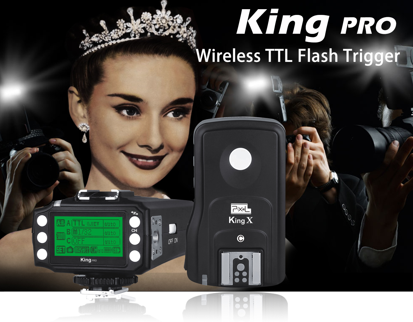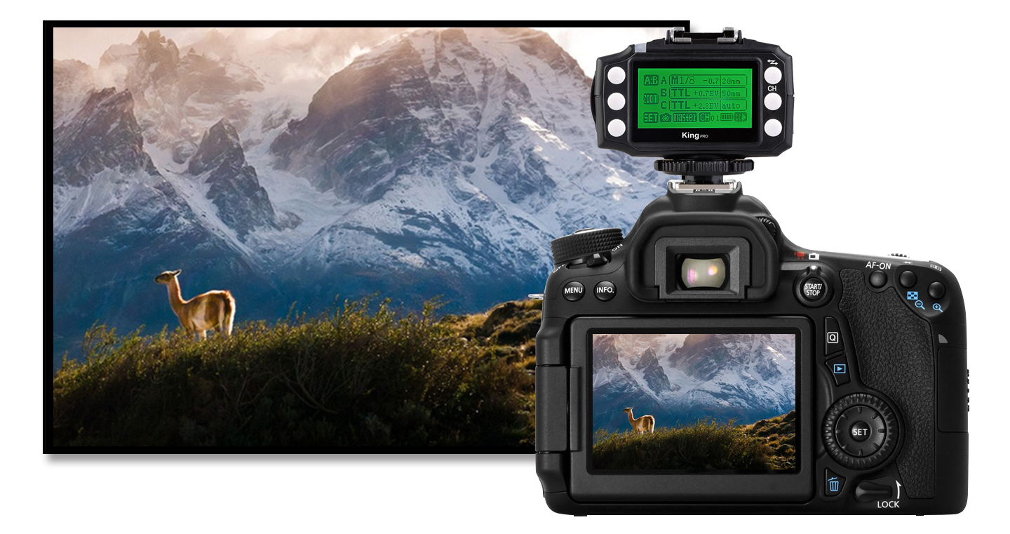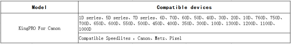 Pixel 3rd Generation Wireless TTL Flash Trigger King Pro for Canon is suitable for Canon cameras. Using digital FSK 2.4GHz wireless remote control. Compared to the previous two generations, the effective remote control distance improved significantly to 300M or above. Also, we have made a very big change in the functional operation.