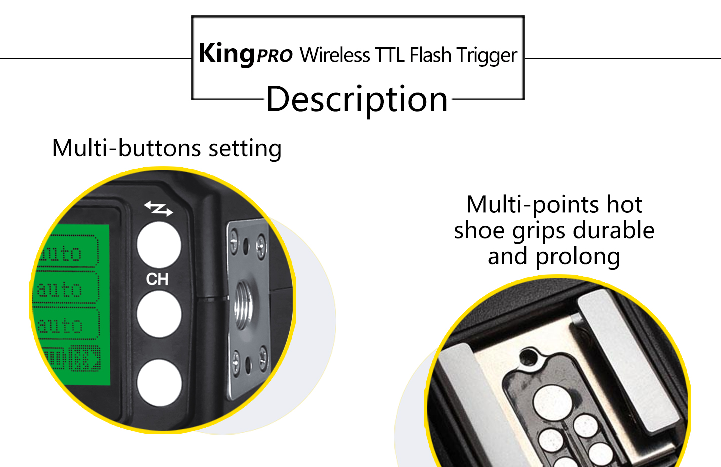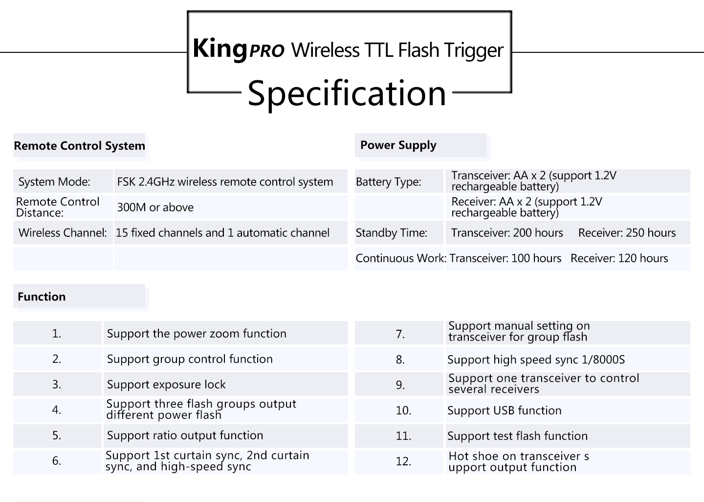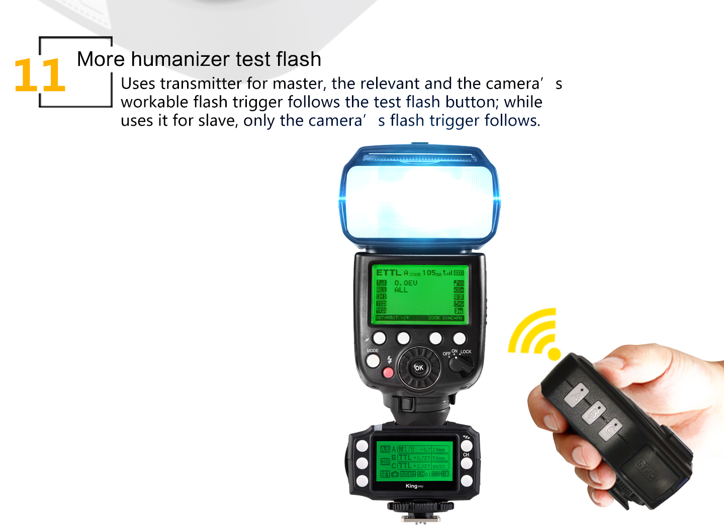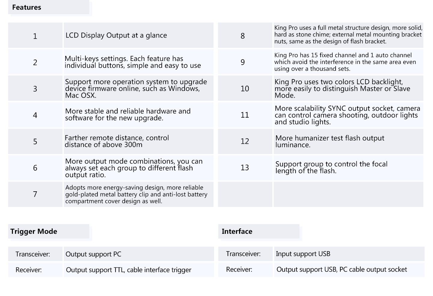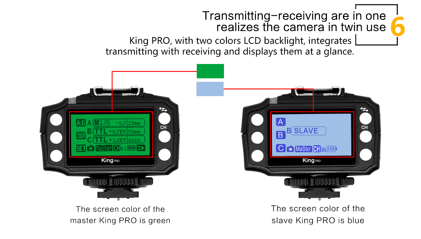 Feature: 1. LED Display Output at a glance. 2. Multi-keys Settings. Each feature has individual buttons, simple and easy to use 3. Support more operation system to upgrade device firmware online, such as Windows, Mac OSX. 4. More stable and reliable hardware and software for the new upgrade. 5. Farther remote distance, control distance of above 300m. 6. More output mode combinations, you can always set each group to different flash output ratio. 7. More energy-saving design and the use of more reliable gold-plated metal battery clip as well as anti-lost battery compartment cover design. 8. King Pro uses a full metal structure design, more solid, hard as stone chime; external metal mounting bracket nuts, same as the design of flash bracket. 9. King Pro uses 15 fixed channels, 1 automatic channel mode; allow thousand sets of products to be used in the same area without interference. 10. King Pro uses two-color LED backlight, more easily to distinguish Master or Slave Mode. 11. More scalability SYNC output socket, camera can control camera shooting. Also, can control outdoor lights and studio lights. 12. More humane test flash for brightness output. 13. Support group to control the focal length of the flash.
