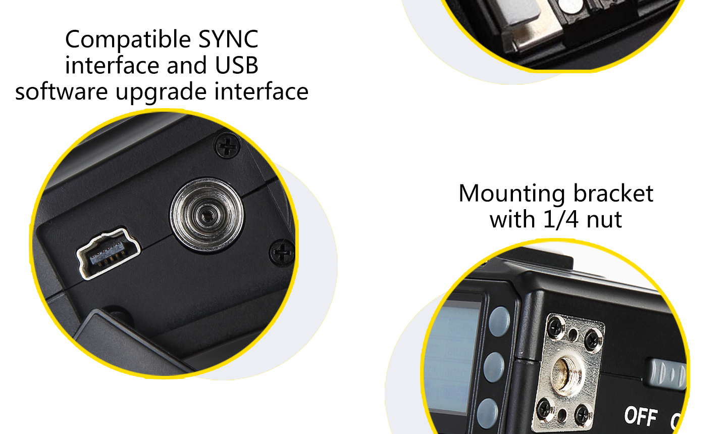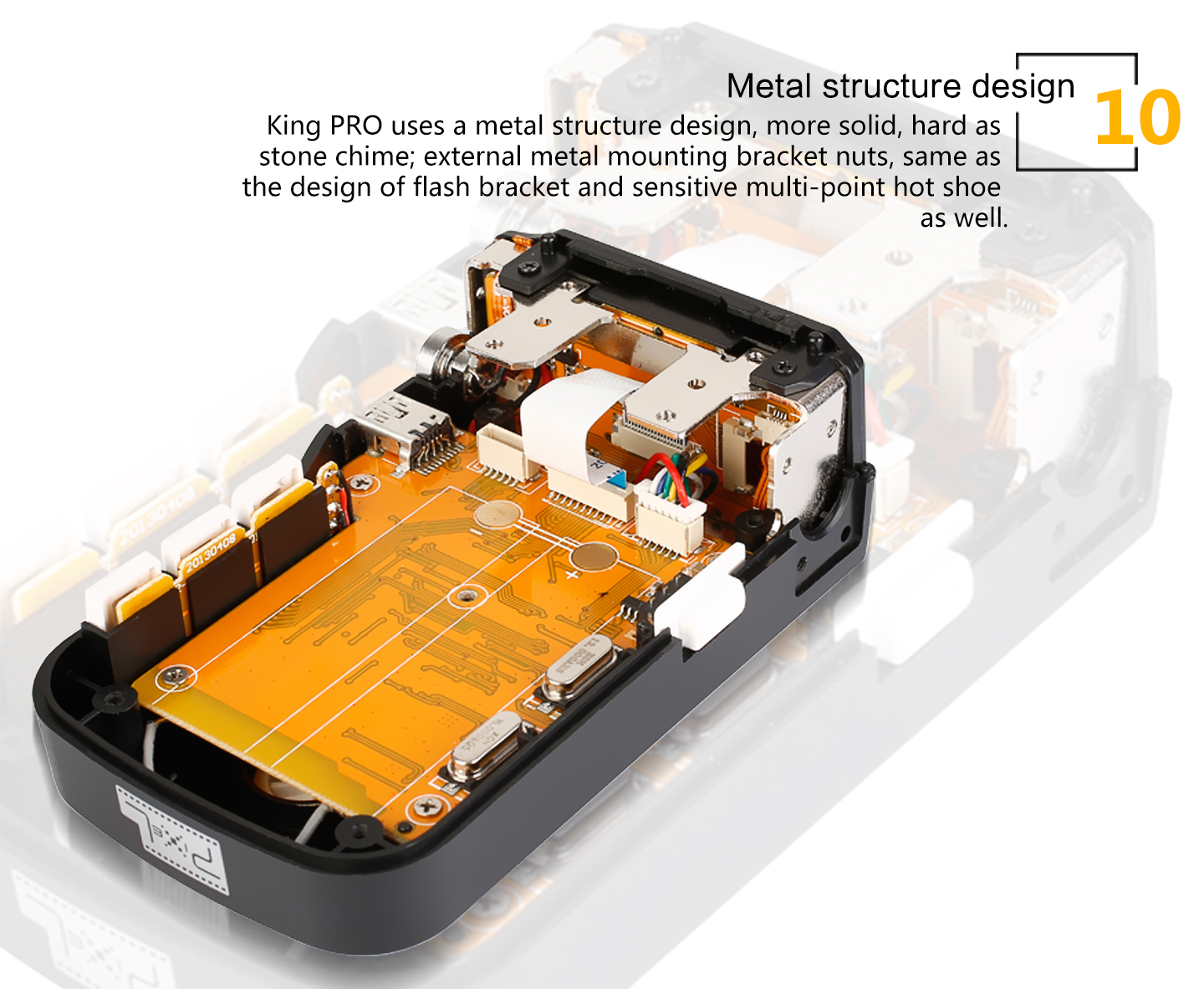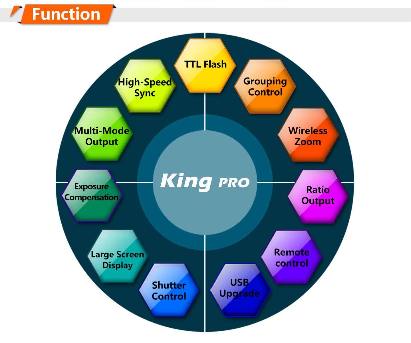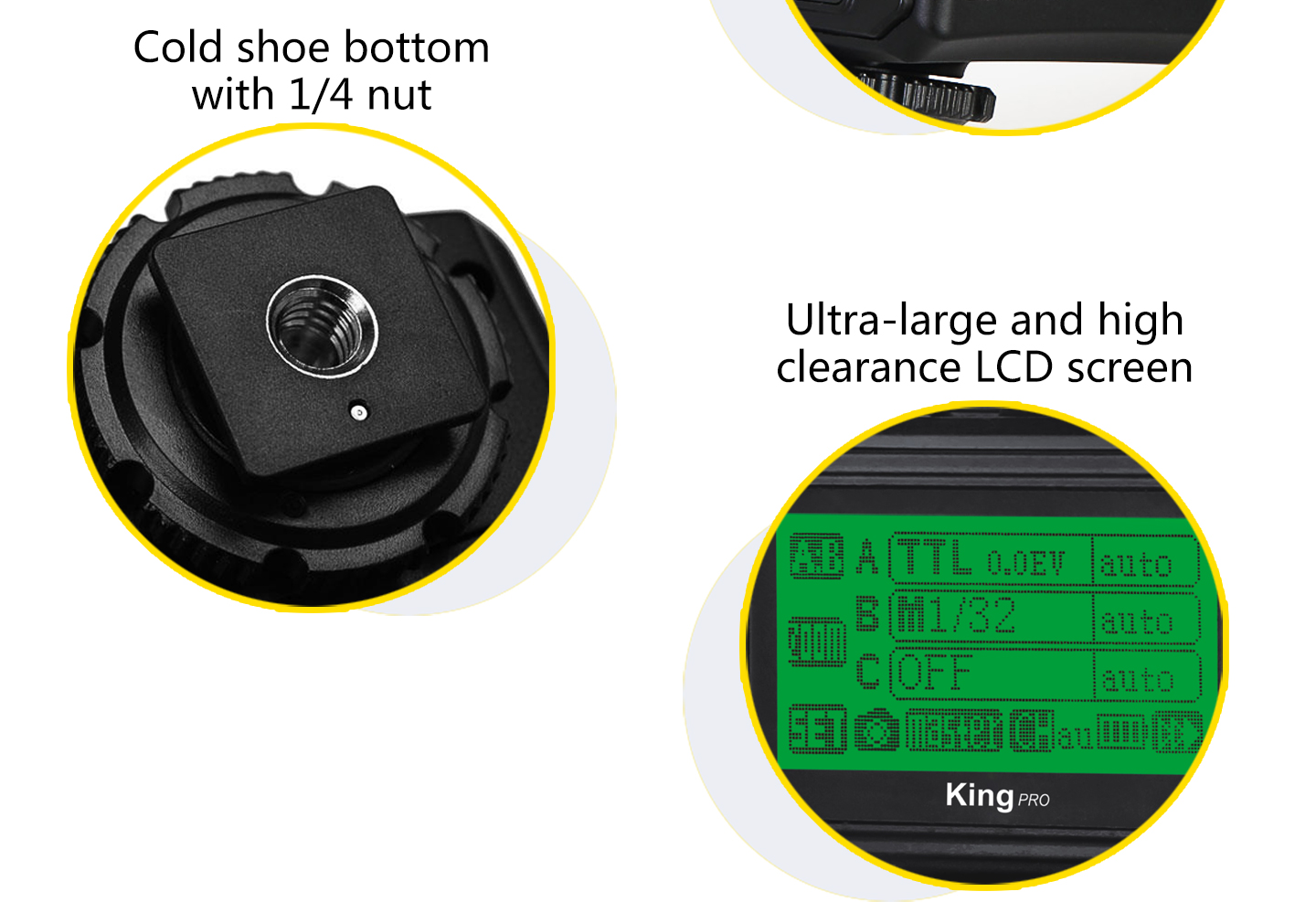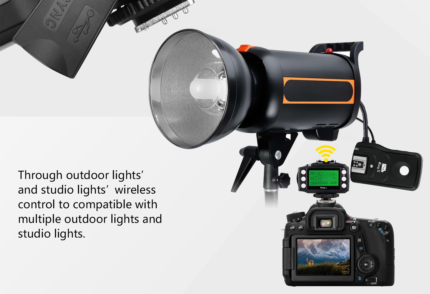 Feature: 1. LED Display Output at a glance. 2. Multi-keys Settings. Each feature has individual buttons, simple and easy to use 3. Support more operation system to upgrade device firmware online, such as Windows, Mac OSX. 4. More stable and reliable hardware and software for the new upgrade. 5. Farther remote distance, control distance of above 300m. 6. More output mode combinations, you can always set each group to different flash output ratio. 7. More energy-saving design and the use of more reliable gold-plated metal battery clip as well as anti-lost battery compartment cover design. 8. King Pro uses a full metal structure design, more solid, hard as stone chime; external metal mounting bracket nuts, same as the design of flash bracket. 9. King Pro uses 15 fixed channels, 1 automatic channel mode; allow thousand sets of products to be used in the same area without interference. 10. King Pro uses two-color LED backlight, more easily to distinguish Master or Slave Mode. 11. More scalability SYNC output socket, camera can control camera shooting. Also, can control outdoor lights and studio lights. 12. More humane test flash for brightness output. 13. Support group to control the focal length of the flash.