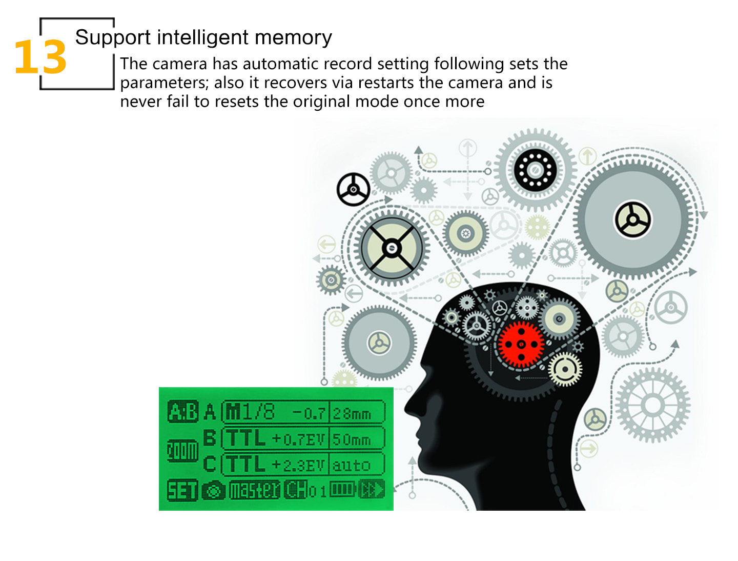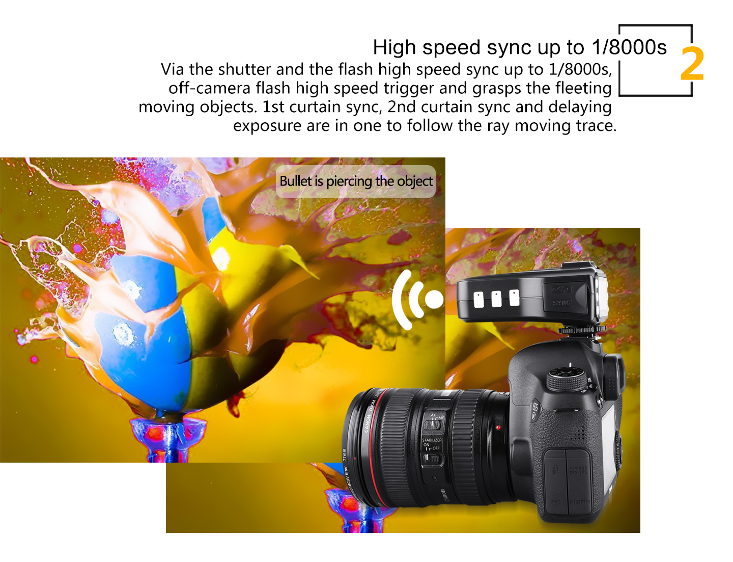 Function: 1. Support the power zoom function 2. Support group control function 3. Support exposure lock 4. Support three flash groups output different power flash 5. Support ratio output function 6. Support 1st curtain sync, high-speed sync 7. Support high speed sync 1/8000S 8. Support ISO, exposure compensation, FV lock and FP function 9. Support one transceiver to control several receivers 10. Support USB function