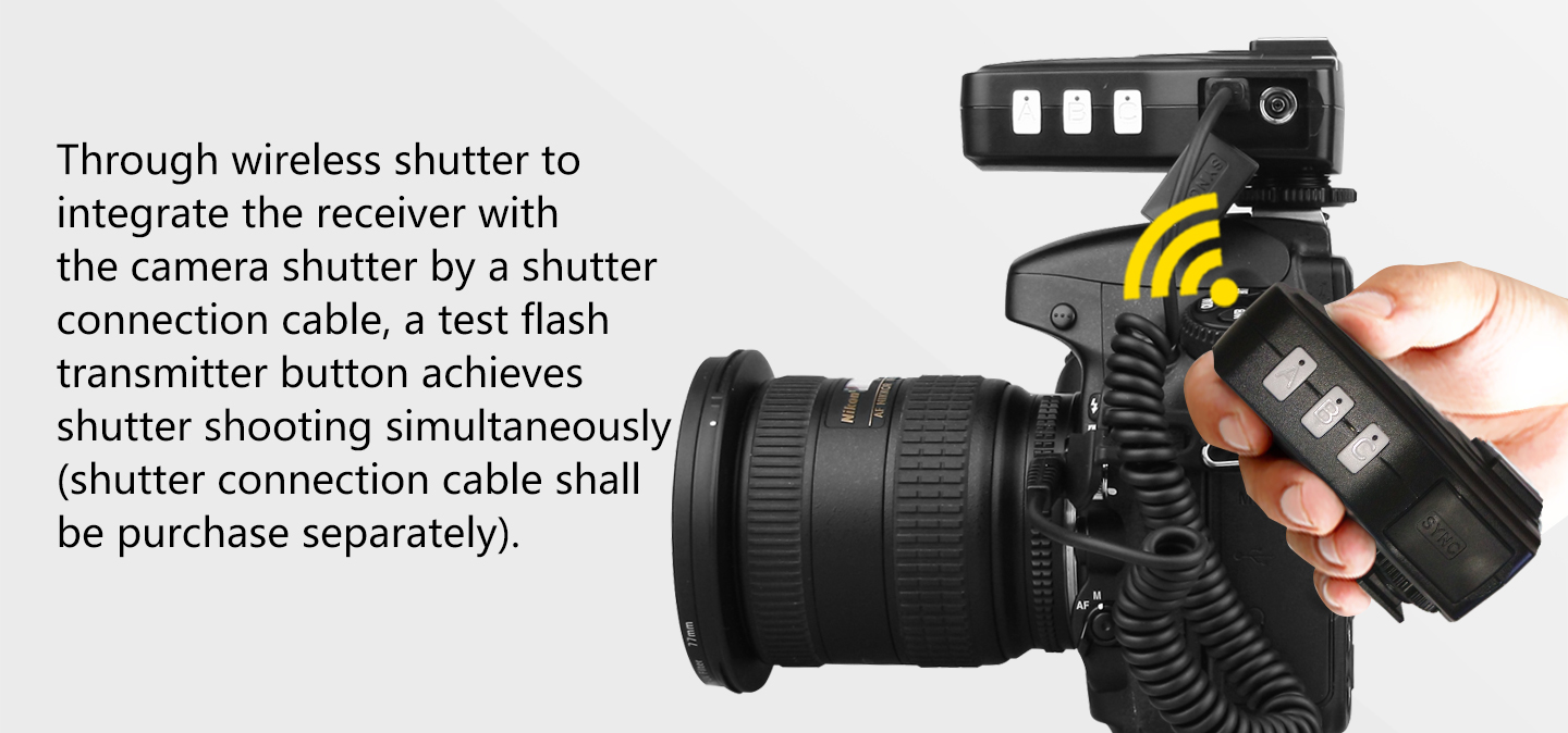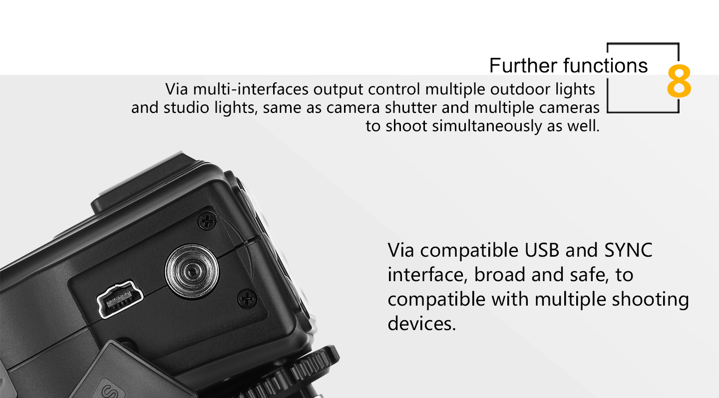 11.More scalability SYNC output socket, camera can control camera shooting. Also, can control outdoor lights and studio lights.